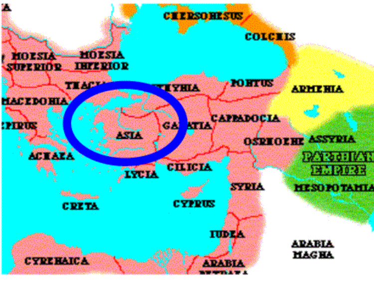 "Asia" refers to the Roman Province of Asia. R.H Charles, op. cit., p..xxii, notes, "We gather from the Apocalypse that John the Seer exercised an unquestioned authority over the Churches of the Province of Asia." An example of such an authority is found in the account of the Martyrdom of Polycarp [Ante-Nicene Fathers, vol. i, "The Encyclical Epistle of the Church at Smyrnam", cap. XII.] While he spoke these and many other like things, he was filled with confidence and joy, and his countenance was full of grace, so that not merely did it not fall as if troubled by the things said to him, but, on the contrary, the proconsul was astonished, and sent his herald to proclaim in the midst of the stadium thrice, "Polycarp has confessed that he is a Christian." This proclamation having been made by the herald, the whole multitude both of the heathen and Jews, who dwelt at Smyrna, cried out with uncontrollable fury, and in a loud voice, "This is the teacher of Asia, the father of the Christians, and the overthrower of our gods, he who has been teaching many not to sacrifice, or to worship the gods." Indeed, it was to St. Polycarp that St. Ignatius wrote while on his way to be thrown to the beasts in the Coliseum at Rome [ANF, vol. i, "The Epistle of Ignatius to Polycarp", cap. VIII"]. Inasmuch as I have not been able to write to all the Churches, because I must suddenly sail from Troas to Neapolis, as the will [of the emperor] enjoins, [I beg that] thou, as being acquainted with the purpose of God, wilt write to the adjacent Churches, that they also may act in like manner, such as are able to do so sending messengers, and the others transmitting letters through those persons who are sent by thee, that thou mayest be glorified by a work which shall be remembered for ever, as indeed thou art worthy to be.